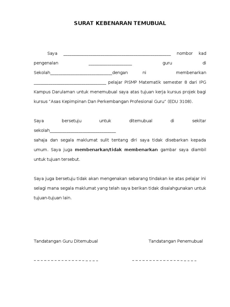 Surat Kebenaran Utk Menemuramah Datuk. Tujuan kami menemuramah tuan adalah untuk menyempurnakan tugasan kertas kerja bagi kod subjek HRM554 Talent Recruitment and Selection. Full PDF Package Download Full PDF Package.